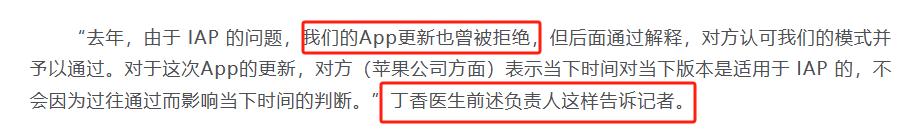 2019 年,丁香医生 App 也曾因为在线图文问诊费用是否适用于 IAP 而与苹果发生冲突,导致使用第三方支付的 App 无法更新。