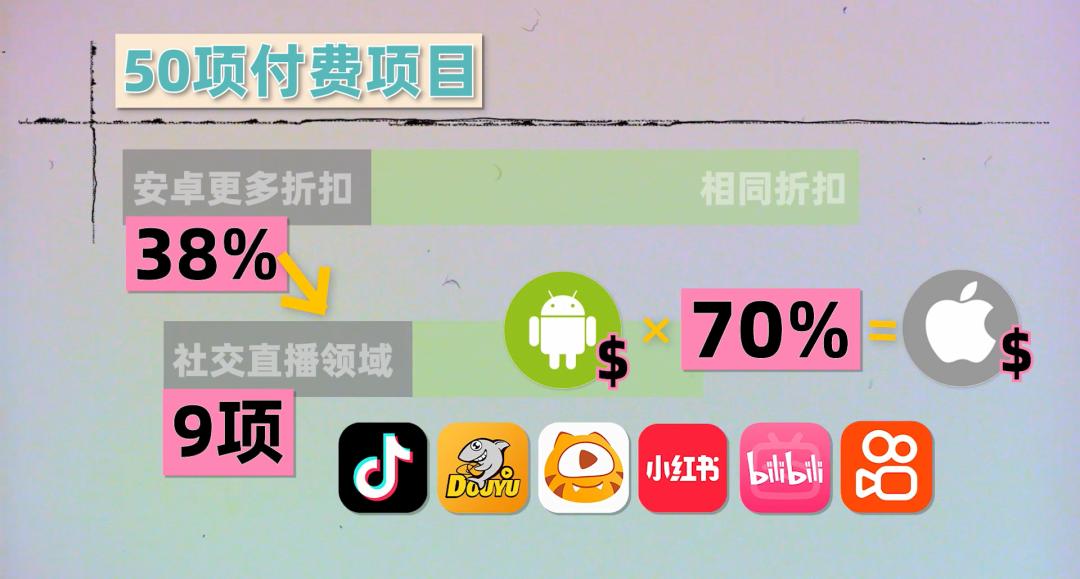 在 B 站给主播上一个舰长,iOS 用户要多花 60 元,在抖音给主播送一个 1200 钻的跑车,安卓用户价格是 120 元,而 iOS 用户要 171 元。