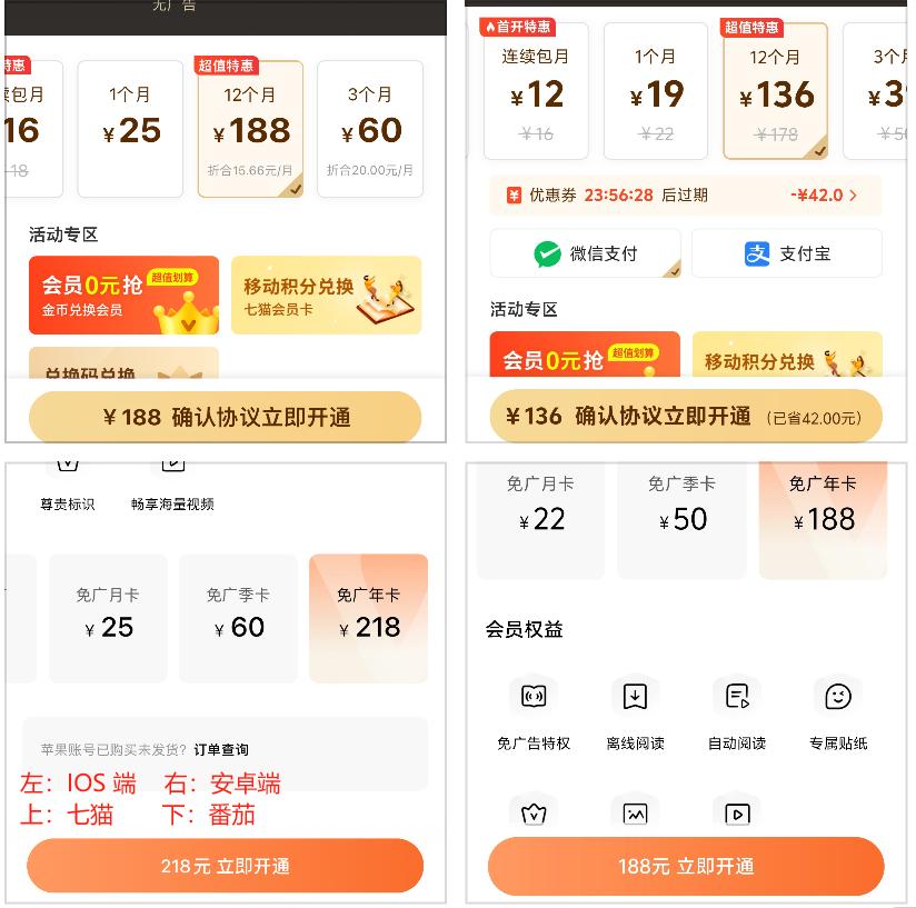 番茄小说在 iOS 端 218 元的免广告年度会员,安卓端便宜了 30 元。