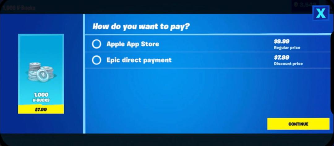 Epic 为玩家提供了两个选择:一是 App Store 支付,二是 Epic 直接支付,后者玩家可支付更低的金额购买游戏道具。