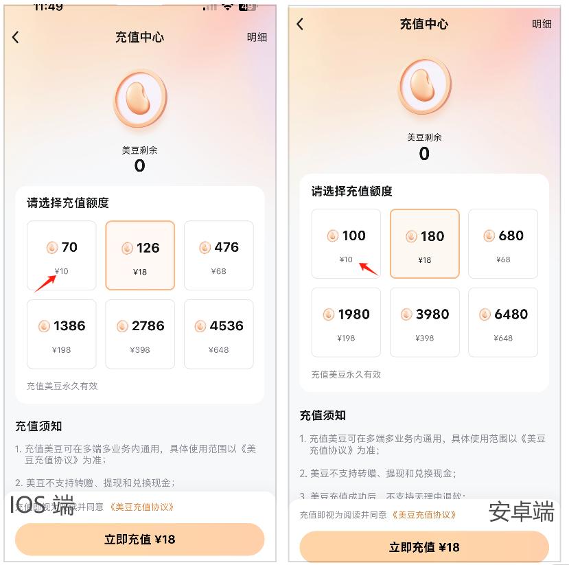 不过美图的虚拟币美豆,安卓 10 元买 100 个,iOS 只有 70 个。