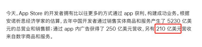 而在中国,2022 年这项营收为 210 亿美元左右,按照 Sensor Tower 的比例计算,参照苹果营收的增速 11.3% ,苹果 2023 年在中国通过苹果税也能赚到 482 亿人民币。