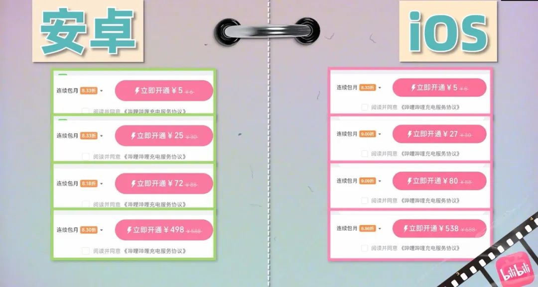 B 站的包月充电,两个平台也不一样,如果我最近要给某动物世界博主充电,在价格高的几档,iOS 都要比安卓贵一些。