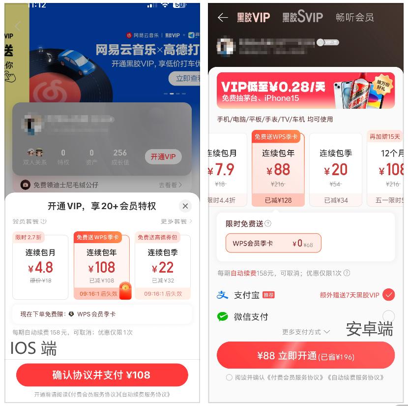 网易云的黑胶 VIP ,iOS 端连续包年是 108 元,而安卓是便宜 20 的 88 块,它们都有赠送其他 App 季卡,只不过 iOS 端可选项多一些。