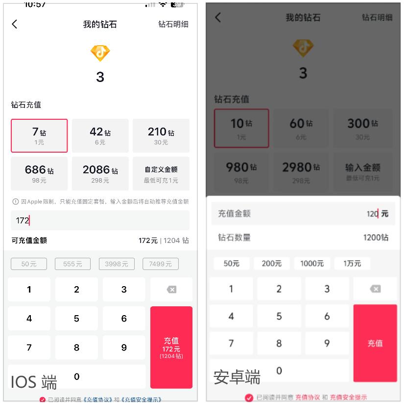 不管是在 B 站购买电池,还是在抖音、快手、小红书、斗鱼、虎牙这些平台购买虚拟货币,同样的价格,iOS 端买到的都只有安卓端的 70% 。