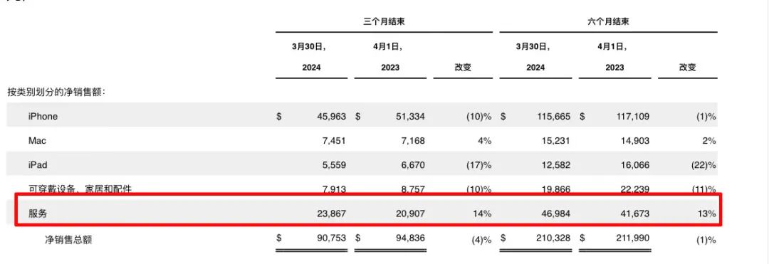 根据苹果在 5 月初发布的最新财报,2024 年第一季度,苹果营收整体下降了 4%,但服务营收却逆势上涨了 14%,是收入增长最快的,也是苹果第二大收入来源,占比达到 26%。