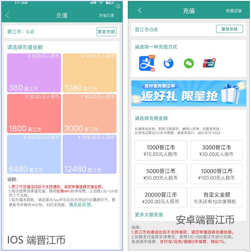 晋江文学城的晋江币,安卓 1 元可以购买 100 晋江币,只有在微信支付时扣除 1% 的手续费。但 iOS 上,手续费高达 40% ,1 元只有 60% 的晋江币。