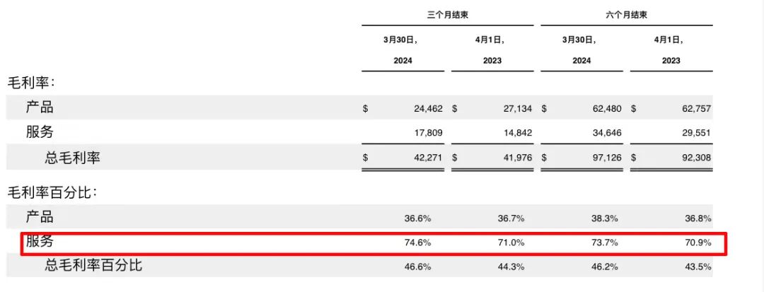 更恐怖的是服务业务的利润,苹果产品够贵了吧,产品毛利率为 36.6%,而服务这一块毛利率达到了 74.6%。