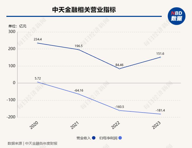 自此之后,中天金融的盈利水平便开始逐年下滑。2021年,随着房地产行业景气度下降,其净利润彻底由正转负,并出现了高达64.16亿元的巨额亏损,债务压力陡增。2022年及2023年,中天金融归母净利润分别达-160.50亿元和-181.44亿元,亏损仍在持续扩大。截至2023年12月31日,中天金融总资产1239亿元,总负债则超过1530亿元,严重资不抵债。