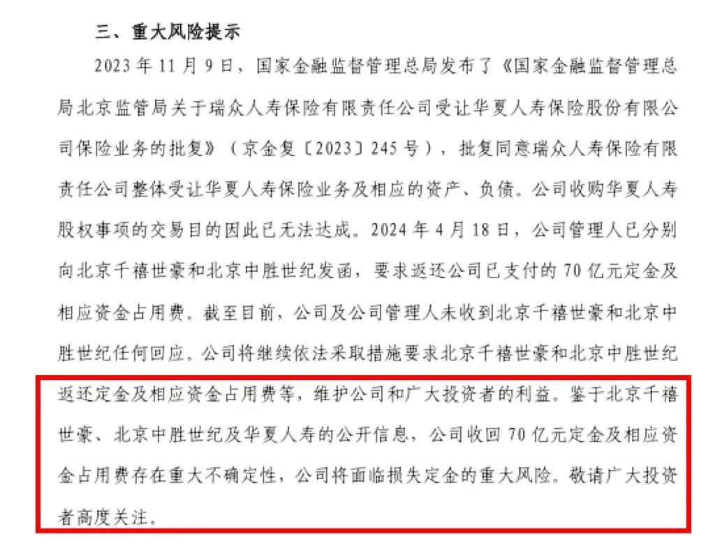 “截至目前,公司及公司管理人未收到北京千禧世豪和北京中胜世纪任何回应。”中天金融表示,鉴于北京千禧世豪、北京中胜世纪及华夏人寿的公开信息,公司收回70亿元定金及相应资金占用费存在重大不确定性,公司将面临损失定金的重大风险。