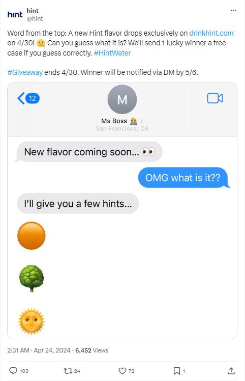例如在X上,Hint的官方账号会定期发布风味相关的创意内容。4月30日柑橘风味上线之前,Hint通过emoji的形式向粉丝提供新产品风味的“线索”,这引起了大量粉丝的猜测和讨论,这则帖子收获了103条留言和6452次浏览。