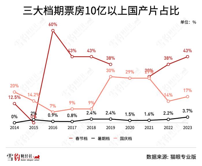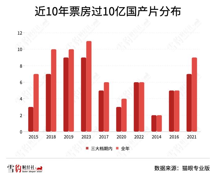 雪豹财经社梳理近10年票房数据后发现,全年票房10亿以上国产片几乎都来自春节档、暑期档和国庆档。从2021年起,暑期档和春节档中票房达到10亿以上的国产片的占比均呈上升趋势。