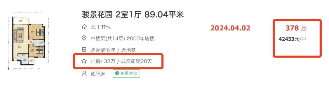 再比如,同样位于金融城板块的骏景花园,一套房子的楼龄达到24年,仅挂牌20天,带看4次,1次降价60万,就已成交。