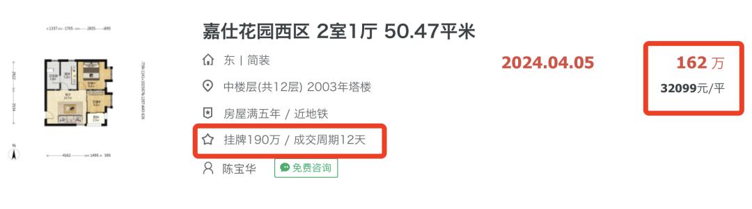同样位于海珠中心区的嘉仕花园西区,一套房源的楼龄超过20年,挂牌12天就成交,期间价格降了28万。