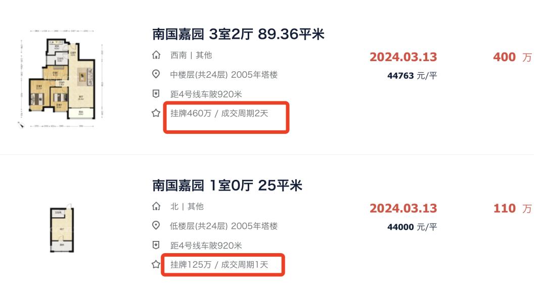 再比如,位于金融城板块(东圃)的南国嘉园,楼龄接近20年,最近两套房源迅速成交,分别只用了一天和两天👇。