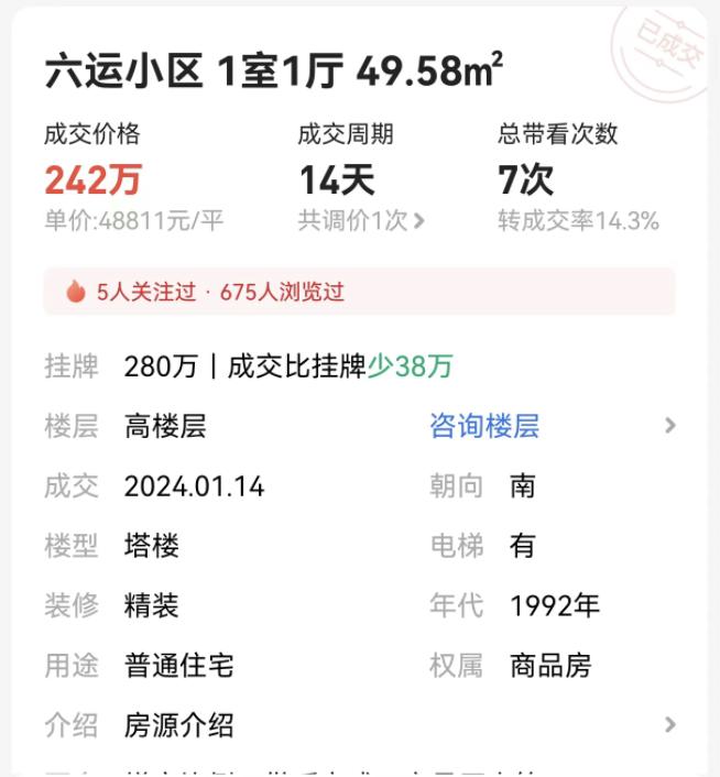 比如,位于珠江新城隔壁的六运小区,一套房子的楼龄超过30年,带看次数为7,两周14天就成交了,而且单价高达4.8万/平米,很坚挺。