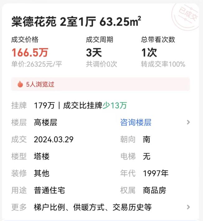 再比如,靠近科韵路的棠德花园,一套房子的楼龄达到27年,带看次数为1,3天就成交了,单价2.6万每平米👇