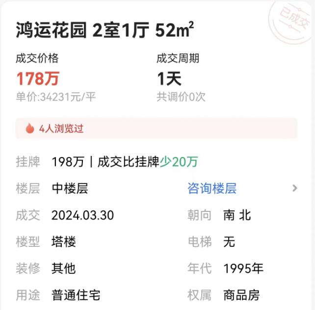 再比如,位于海珠客村板块的 鸿运花园 ,一套房子的楼龄29年, 一天就成交了 ,单价3.4万元每平米。