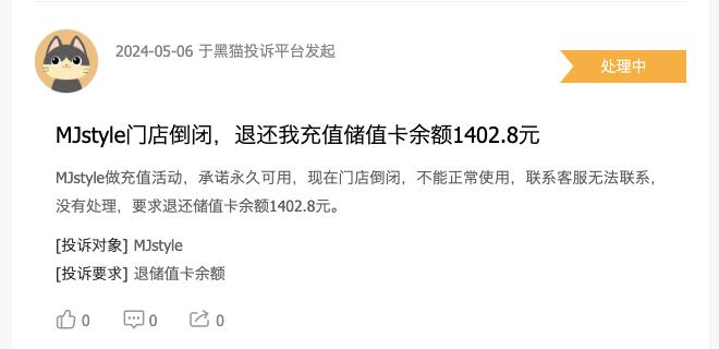 在黑猫投诉上搜索MJstyle相关内容,可以看到,最近,关于退储值卡的申诉明显增多,问题主要集中于人工客服消失不回复,小程序订单不发货,以及储值卡登记退款后被清零却没有收到打款等。其中,未使用余额达数千元的消费者不在少数。