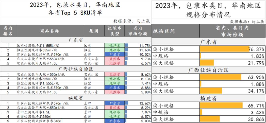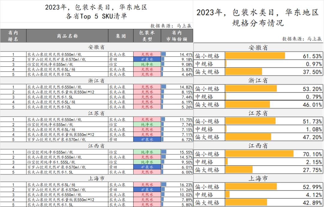 景田、怡宝对农夫山泉发起的围攻也相应地能够从TOP 5 SKU中看出。另外,值得关注的是华南地区TOP 5 SKU中首位与末位的市场份额差距对比其他地区明显更小,换个角度说,也即华南地区农夫山泉、怡宝、景田三个集团的竞争尤为激烈,大有你追我赶、不相上下的意味。规格角度来看,偏小规格平均市场份额相对较高,与偏大规格的差距较大。