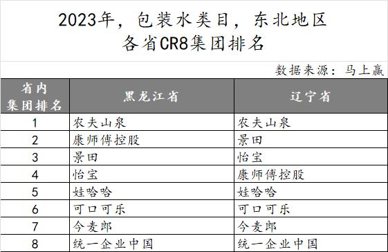 在东北地区各省内,CR8集团排名相对较为稳定,仅有康师傅控股在黑龙江省内排名提升了两个位次而进入CR3,辽宁省的前三名与其他省市类似,为农夫山泉、景田和怡宝。
