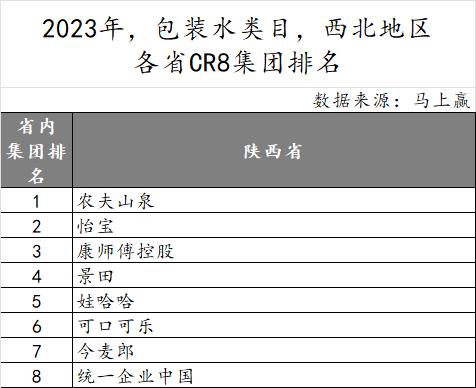 在仅由陕西省构成的西北地区内,虽然康师傅控股成功替代景田,与农夫山泉、怡宝组成了CR3集团,但结合TOP 5 SKU来看,集团间的竞争也不容小觑。