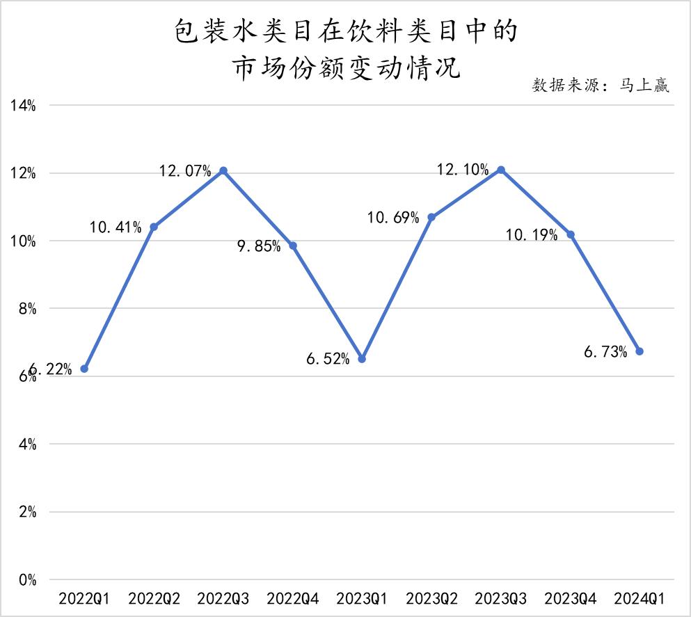 从类目整体看,包装水在饮料类目中的市场份额变动受季节因素影响较大。马上赢品牌CT数据显示,2022年Q1至2024年Q1,包装水类目份额在Q1至Q3期间稳定上涨,在随后的季度中又显著回落。同比看,2022Q1,2023Q1,2024Q1三个季度包装水类目的市场份额有小幅提升的趋势。