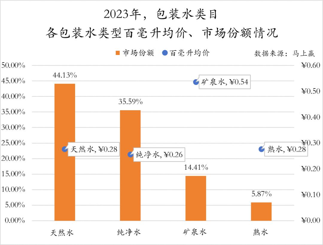 不同包装水类型的市场份额情况也侧面体现出熟水在包装水赛道中“后来者”的角色,其市场份额目前仅有5.87%,相较于已经在包装水市场中培养用户心智已久的其余类型仍差距较大。而在消费者相对熟悉的其他三种类型中,天然水、纯净水每百毫升均价相差不大,市场份额间的差距也相对更小,其中天然水以一己之力占据了包装水市场44.13%的市场份额,纯净水目前的市场占有为35.59%。相较之下,矿泉水每百毫升均价来到了0.5-0.6元的区间,价格显著提高的同时市场份额也相应更低,2023年仅略高于熟水、占据了14.41%。