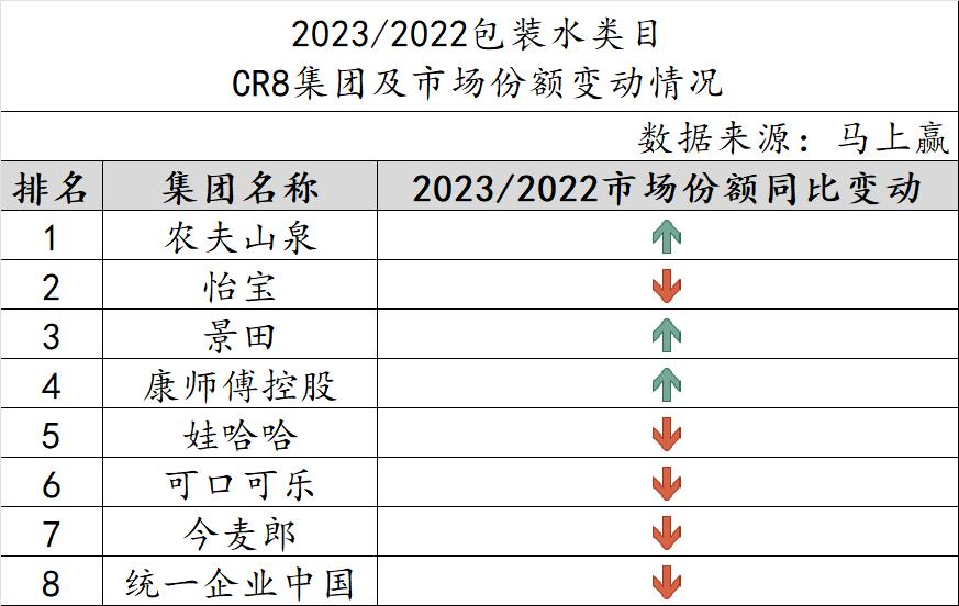 包装水类目整体集中度较高,CR8占据了超过90%的市场份额。但在CR8集团内部,2023年仅有农夫山泉、景田和康师傅控股市场份额同比有一定的提升,而怡宝、娃哈哈、可口可乐、今麦郎以及统一企业中国的市场份额则有所下降。