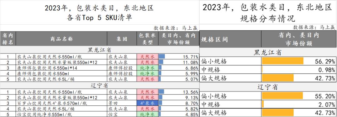 东北地区各省的TOP 5 SKU也与每个省内的CR3集团相对应,被CR3集团内不同SKU所瓜分。而从规格的角度看,偏小规格因其便携性而更加契合即时消费场景,市场份额明显高于其他规格产品;而偏大规格的市场份额则受性价比等因素拉动,总体也相对较高,二者差距相对较小。