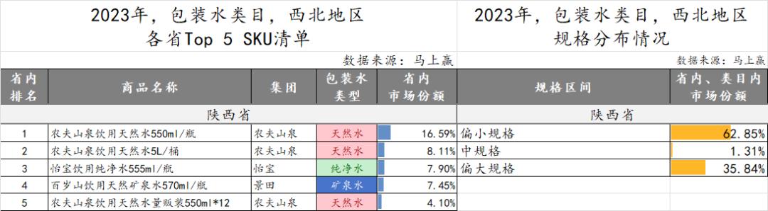 可以看到,TOP 5 SKU中并没有康师傅控股旗下产品的身影,反倒是景田旗下的百岁山饮用天然矿泉水位居第四。可见,康师傅控股或许是依靠丰富的产品矩阵成功超越了景田的市场份额,但其对大单品的打造仍任重而道远。陕西省内同样是以偏小规格为主,偏大规格与其差距在27%左右。