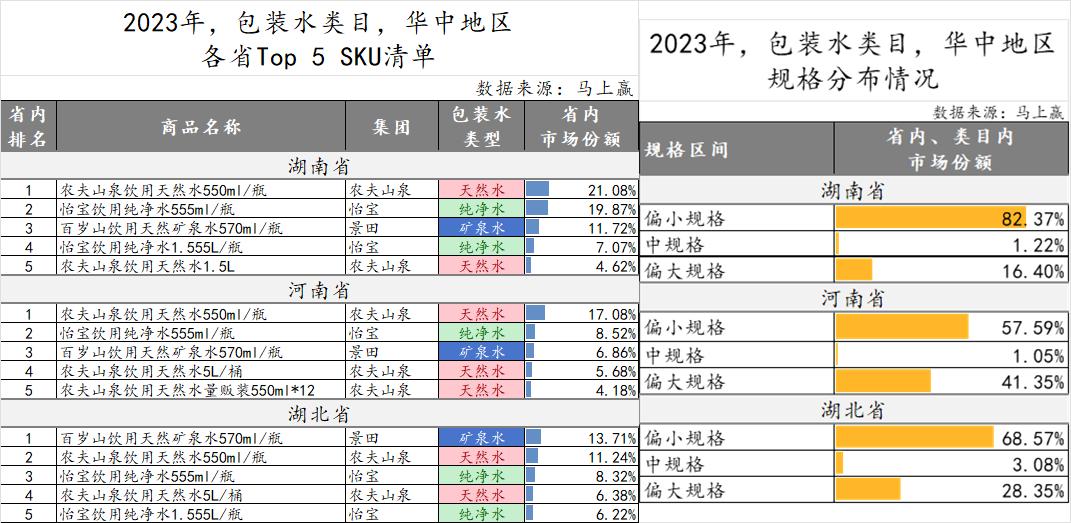 对比前面两个地区,华中地区TOP 5 SKU内的集团多样性、包装水类型多样性更加丰富,反映出CR3集团在华中地区不同省市内的势力差距相对较小,尚未形成一家独大的局面。另一方面,华中地区相较于前面两个地区虽同样是以偏小规格为主,但偏小规格与偏大规格的差距总体来说更加显著,尤其是湖南省内二者的差距来到了65.97%。