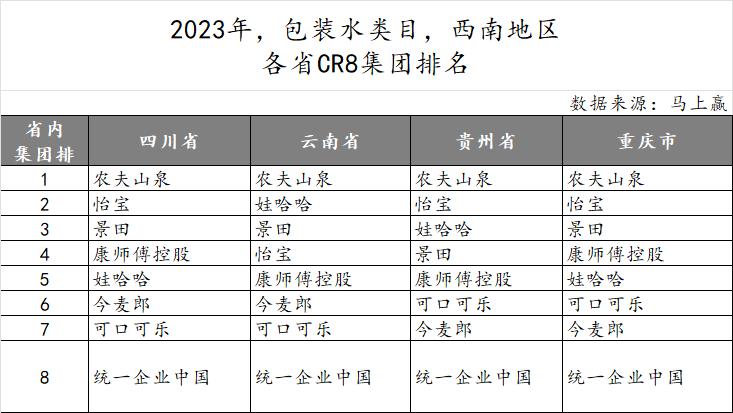 西南地区中CR8集团排名变动的看点集中在娃哈哈对CR3发起的进攻中,在云南省与贵州省中,娃哈哈均成功挤进了CR3之列,分别排至第二、第三位,与此相对的则是怡宝与景田分别在两个省内市场份额排名下降至第四。