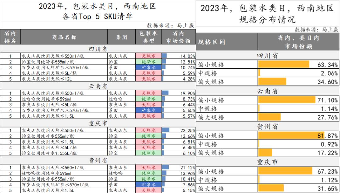 从TOP 5 SKU来看,娃哈哈之所以能在部分省市内夺得第二位,与旗下娃哈哈饮用纯净水596ml在市场内的影响有一定关联。此外,在贵州、云南以及重庆三省内,农夫山泉饮用天然水550ml的市场份额均在20%左右,与占据市场份额第二的SKU拉开了十分明显的差距。