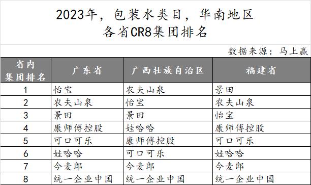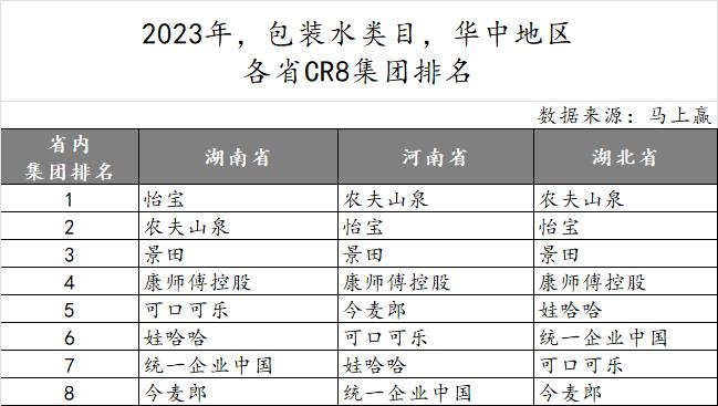 华中地区构成CR3的集团相对稳定,均由农夫山泉、怡宝、景田构成,不同的是在湖南省内怡宝同样超越了农夫山泉拿到了市场份额第一的位置。