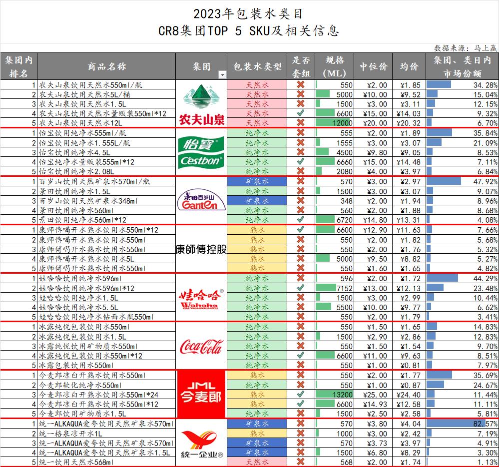 值得注意的是,CR8集团TOP 5 SKU在包装水类型上差异较大。整体来看,不同集团在包装水类型上主攻的方向也有所不同。其中,农夫山泉主要依靠天然水打下一片江山,怡宝、娃哈哈、可口可乐以纯净水为主要发力点,而康师傅控股、今麦郎则是凭借熟水进入包装水市场。此外,还有部分集团正通过丰富包装水类型的方式进一步拓展其市场空间,如景田集团对矿泉水和纯净水的兼顾,今麦郎、康师傅在熟水与纯净水的双栖发展,以及统一企业中国对矿泉水、熟水、天然水三种不同类型包装水的探索。