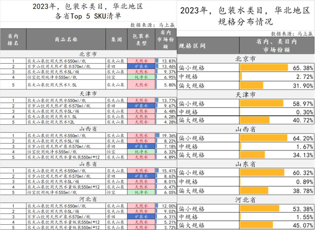 农夫山泉在华北地区的影响力也渗透在了各省市TOP 5 SKU清单之中,每个省市的TOP 5 SKU中均有3-4款为农夫山泉旗下产品。此外,相较于前面三个地区,矿泉水在华北地区各省市TOP 5 SKU中出现得也更频繁,且基本上为TOP 3 SKU之一。从规格的角度上看,不难发现偏小规格与偏大的规格的市场份额差距更小,在差距最大的北京市内也仅有33.48%。