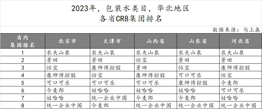 从华北地区CR8集团的排名上看,怡宝对农夫山泉发起的进攻并未取得明显的效果,农夫山泉稳居其位。反倒是康师傅控股对CR3集团发起的攻势成效显著,在河北省、天津市内均位列第三,将怡宝挤出了前三。