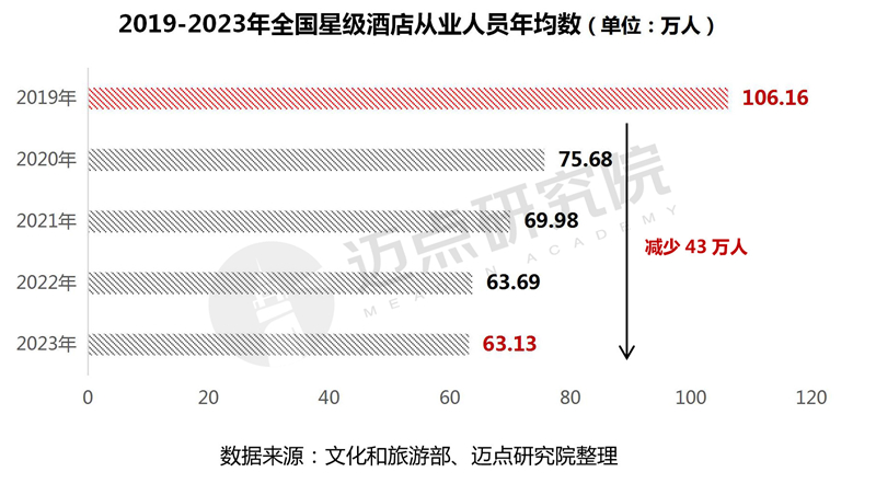 从业人员年均数情况:全国星级酒店从业人数连年下降。自2019年至2023年五年间,全国星级酒店从业人数从106.16万人减少至63.13万人,共计减少43万人。一方面,酒店企业在2020年以来的特殊时期,面临需求骤减,经营承压的情况,只能主动降本增效;另一方面,在数字化浪潮的推动下,酒店数字化产品为酒店投资人和管理者带来了更智能、高效的管理方式,越来越多的酒店采用智能化管理,优化流程,减少人力成本。