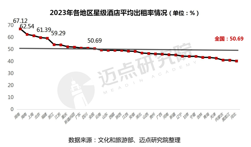 各地区星级酒店平均出租率情况:32个地区中高于全国星级酒店平均出租率(50.69%)水平的地区共有11个。其中,湖南、海南、上海三个地区平均出租率高于60%,领跑全国。值得留意的是,2023年,北京和上海这两个城市星级酒店平均出租率——59.84%、61.39%,同比变化最大,分别同比增长90.76%和59.54%,出租率回归第一梯队,主要因为2022年,北京、上海受到疫情因素多轮影响,酒店经营受到严重扰乱,出租率大幅下滑。而2023年,随着商旅需求集中爆发,酒店热度回暖,以北京、上海等为代表的一线城市酒店出租率迅速回升。