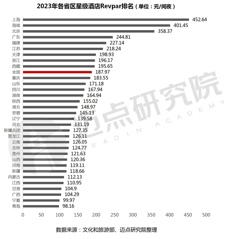 各省市地区星级酒店每间可供出租客房收入(Revpar)情况:2023年上海、海南两个地区星级酒店Revpar(452.64元/间夜、401.45元/间夜)以高于400元/间夜的水平引领全国,北京(358.37元/间夜)次之。同比2022年,北京和上海两个地区星级酒店Revpar同比增长最快(122.98%、109.09%)。其余高于全国水平(187.97元/间夜)的地区还有广东、福建、江苏、天津、浙江和西藏6个地区。
