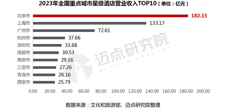 50个重点旅游城市星级酒店营业收入情况:50个重点旅游城市星级酒店营业总收入合计1017.46 亿元,占全国星级酒店营收总额(1608.95 亿元)的63.24%。其中,营业收入超百亿元的有北京市、上海市,分别为182.15亿元和133.17亿元;营业收入处于50-100亿元的有广州市(72.61 亿元);营业收入处于20-50亿元之间的包括杭州、深圳、成都、南京、三亚、青岛、西安、厦门、济南、重庆和苏州11个城市,其余36个城市营收在1-20亿元之间,西宁市星级酒店营业收入最低(1.85亿元),排在50个城市的末尾。
