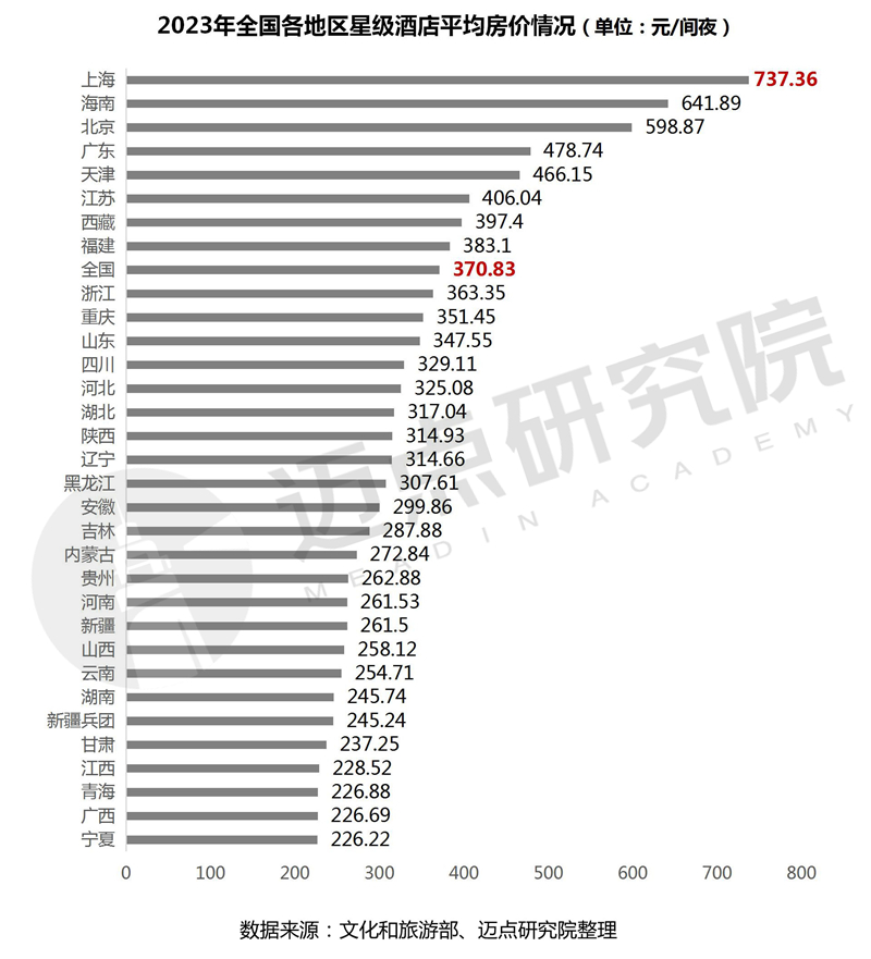 各地区星级酒店平均房价情况:32个地区中高于全国星级酒店平均房价(370.83元/间夜)的地区仅有8个,从高到低依次为上海、海南、北京、广东、天津、江苏、西藏和福建。其中上海市星级酒店平均房价737.36元/间夜,同比上升 31.07%,平均房价及同比增幅在前十中均位列第一,以绝对优势位列全国第一。青海、广西、宁夏等地区星级酒店平均房价排在全国末尾,具有较大的提升空间。