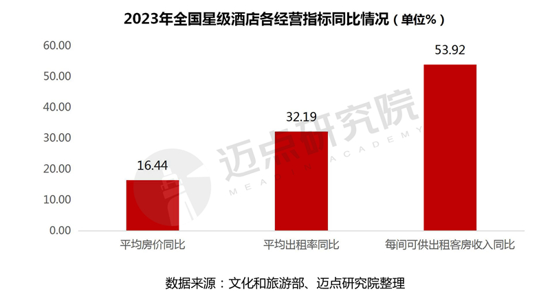 2023年,全国星级酒店经营状况回暖,多项经营指标大幅增长,酒店业迎来强劲复苏。据近期文化和旅游部公布的2023年全国星级酒店经营数据:2023年,共有7245家星级酒店数据通过审核,营业总收入1608.95亿元,同比增长超三成;利润总额29.17亿元,实现扭亏为盈;平均房价、平均出租率、每间可供出租客房收入(Revpar)等经营指标也迎来正增长:其中,平均房价370.83元,同比上升16.44%;平均出租率50.69%,同比上升32.19%;Revpar 187.97元/间夜,同比上升53.92%。