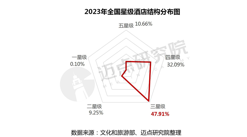 从星级酒店组成结构分析,7245家星级酒店中五星级酒店772家、四星级酒店2325家、三星级酒店3471家、二星级酒店670家、一星级酒店7家。与2022年相似,三星级酒店数量最多,占比47.91%;其次是四星级酒店,占比32.09%,三星级和四星级合计占比80%,说明中端、中高端酒店仍将占据市场的主要地位。相比2022年,四星级酒店数量增加40家,是唯一数量在增加的酒店星级;而其他星级酒店数量都逐年走低,尤其是低星级酒店,受到市场经营环境转变及经济型酒店替代效应影响,数量快速减少。