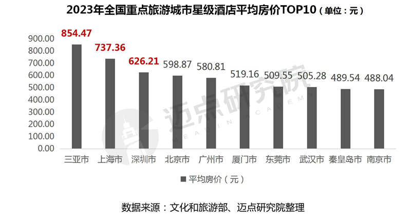 50个重点旅游城市平均房价情况:高于全国平均水平(370.83元/间夜)的城市有25个,占据一半。其中,前三名分别是三亚、上海和深圳,房价分别是854.47元、737.36元和626.21元。 其余位列前十的城市,包括北京、广州、厦门、东莞、武汉、秦皇岛和南京,平均房价位于400-600元之间,价格整体差距不大。