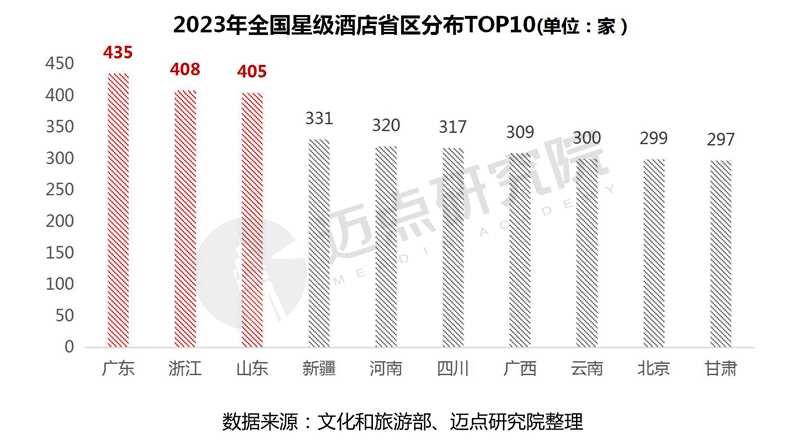 从各地星级酒店数量来看,广东、浙江、山东位列前三,分别有435家、408家、405家。新疆、河南、四川、广西、云南、北京、甘肃位列前十,TOP10地区星级酒店拥有数量总计为3421家,占全国星级酒店总数的47.22%,占比接近一半。相比2022年,TOP10地区中有3个地区排名上升,分别是新疆、河南和四川,其中河南和新疆排名分别上升6和5位,星级酒店数量分别增加39和14家。3个省份排名下降,分别是广西、云南和北京。其余4个地区排名没有变化。