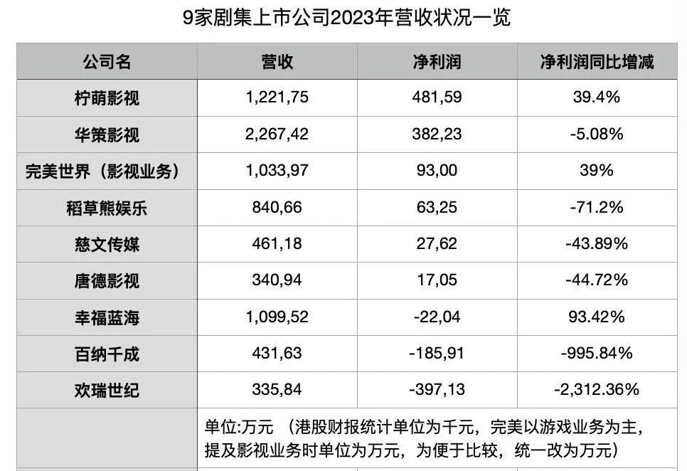主要依靠游戏业务赚钱的完美世界,是差生里面成绩最好的。2023年影视业务实现了10亿的营收,但净利润只有9300多万。而完美去年播出的剧集比华策还多,但加起来的收入不如华策的五部剧、柠萌的三部剧。