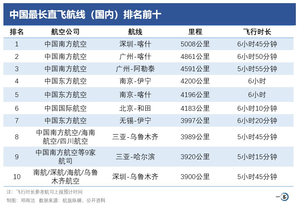 中国南方航空包揽中国最长直飞航线前三,航线为“深圳-喀什”“广州-喀什”“广州-阿勒泰”,里程分别达到5008公里、4861公里和4591公里,飞行时长也在6-7小时左右。