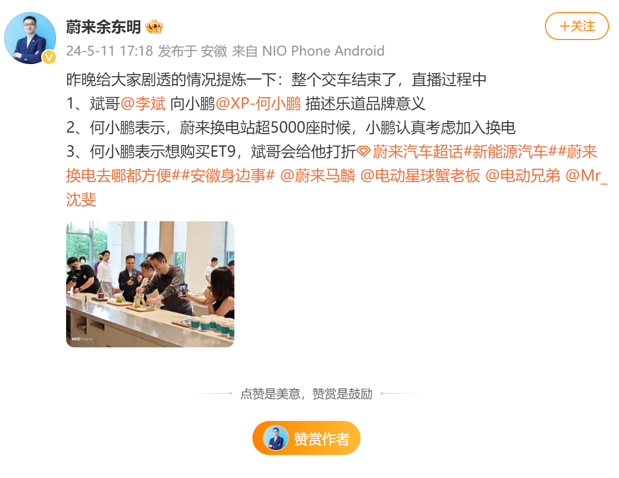 安徽蔚来总经理余东明表示,除了交付小鹏X9,李斌和何小鹏还谈论了三件事,第一件事是李斌向何小鹏阐述乐道品牌的意义;第二件事是何小鹏透露,蔚来换电站超过5000座时,他会考虑加入换电模式;第三件事则是,何小鹏打算买一台蔚来ET9,当然,李斌也要给他打“骨折”。